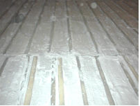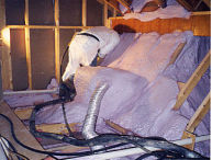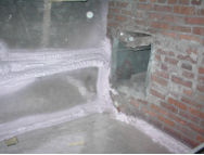 Comments: Injecting a closed cavity creates little waste, requires less masking than spray applications, and has minimal personal health issues (airborne particles) for the applicator. A clean, dry surface will maximize adhesion or bonding. 2. Spray-applied or sprayed-onThis application involves spraying a hot, fast, atomized foam system onto an open surface (like spray painting). The foam reacts, expands, and solidifies on the surface in seconds. This process generates heat, airborne particles, and vapors. The result is a rigid, bonded product which covers the exposed surface in a continuous coating. The rapid expansion requires a proper installation technique to make the coating as even as possible; however, the finish will never be perfectly “flat”. For this reason it is typical to spray-apply an “average thickness” which allows for a certain “plus or minus” tolerance. Alternately, a “minimum thickness” may be specified. The speed and heat of the chemical reaction also requires that the substrate and ambient temperatures be warm before, during, and after the process to prevent thermal shocking of the finished product during the processing and curing periods. Various chemical formulations have different temperature requirements, and the foam system must be appropriately chosen for the specific project conditions. Chemical systems are available for applications as severe as the frozen earth project at Boston’s “Big Dig”. The particles and vapors require proper ventilation or personal respiration equipment to be utilized. Masking or protecting finishes from over-spray is required as well.