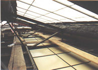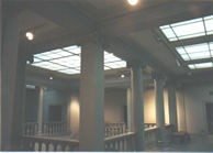 The roof in the original 1929 building is steel-framed with concrete infill below skylights which provide diffused natural light through ceiling lay-lights to the exhibit areas below. Polyurethane foam work for this project included insulating the underside of the low edge of the roof slab and the back of the box gutter built into the cornice. The goal was to reduce heat loss and prevent condensation which was dripping into the galleries below.