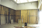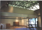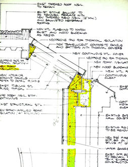 The majority of the gallery renovations involved the installation of new climate-control equipment in the galleries and the art storage spaces. The related building envelope work was designed to reduce equipment size and minimize energy consumption while avoiding the creation of moisture-related problems. The engineer specified 4" of spray-applied polyurethane foam (R=28, perm<.8) and foam sealants to repair and upgrade the exterior wall thermal envelopes in all of the climate-controlled spaces. Polyurethane foam was also used to isolate the pavilion galleries and the art storage areas from the rest of the building. The spray foam was applied directly onto block back-up walls to a thickness designed to prevent condensation on the inside and moisture migration into the masonry. Access to the wall surfaces in the West Pavilion and Fuller Gallery pavilion wings was gained by removing the interior display sheathing. Spray application was chosen over injection as the space behind the walls housed duct work and the size of the wall cavities made filling them impractical.
